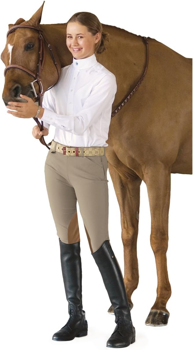 Side zip show breech with Euro Seat, hook and loop at ankle, belt loops and front slash pockets. Ovation's motto is "You Never Looked So Good" and that is so true as these breeches are so figure flattering. Unlike knit fabrics, the EuroWeave is not clingy or revealing. Styled with a moderately low waistband and an easy fit. Medium lite-weight. Classic Show Tan features an in-demand & stylish safari knee patch.