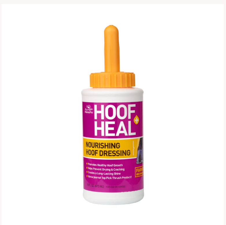 Hoof-Heal's award-winning hoof dressing helps prevent brittle and dry hooves as well as encourages healthy hoof growth. Hoof-Heal creates a flexible barrier that breathes and prolongs hoof protection. Ongoing use of Hoof-Heal helps keep the coronary band, heel, sole and frog healthy and capable of handling impact without cracking. Plus, Hoof-Heal creates a long-lasting show ring shine!