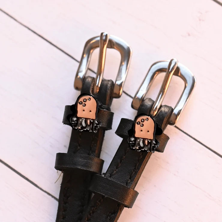 We use strong durable leather to ensure your straps don't stretch but still fit into the slots on your spurs. Accessorizing your equipment with fun charms may lead to improved happiness, smiles and good rides.