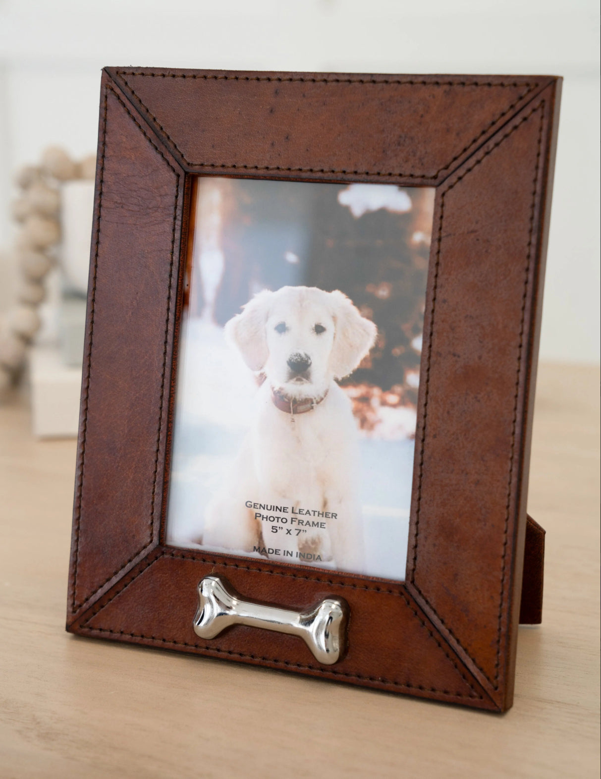 Display your favorite pet memories with the Huntley Pet Leather 5x7 Picture Frame, featuring a charming silver bone accent. This stylish frame is crafted from high-quality leather, giving it a luxurious yet rustic appeal that complements any decor. The soft leather finish adds warmth, while the silver bone detail brings a touch of playful elegance, perfect for highlighting cherished photos of your furry friend. Designed to hold a 5x7 photo, it’s an ideal addition to your desk, mantel, or shelf, celebrating your pet with sophistication and charm. Frame 5 x 7. Package 11 x 9 x 3 inches