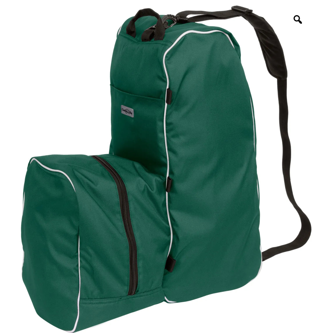 Boot compartment with crop holders along the side measures 23″ tall and has a padded divider to separate the boots when stored. The front zipper compartment is designed to keep your helmet safe. Features a top hand holder, padded adjustable removeable strap, exterior front pocket, sturdy bottom rubber feet, and elastic crop holders. Elegant and practical.
