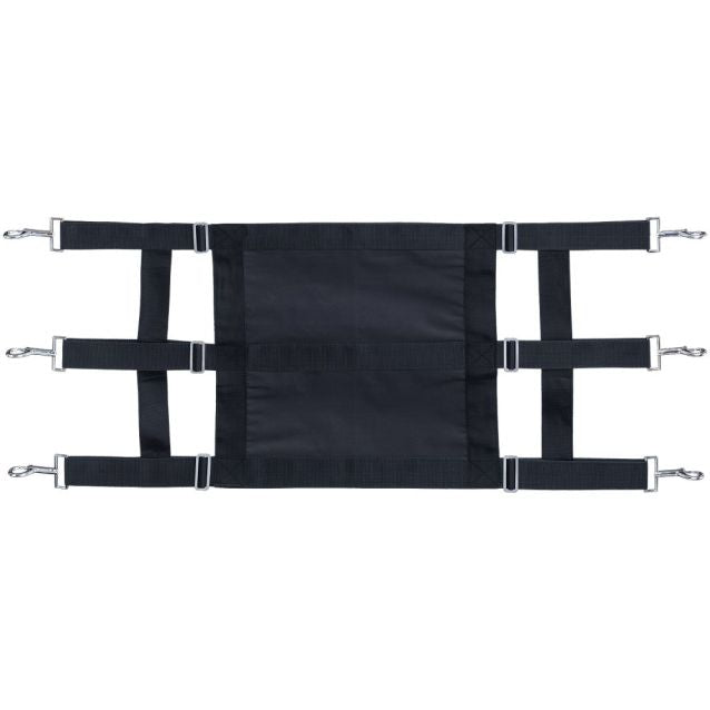 This solid front stall guard is made from extra strong 2” wide poly/nylon webbing with 3 bolt snaps on each side to attach to stall. Complete with slide buckles for adjusting the width, 36” to 48”. This solid front style offers more safety than open styles.